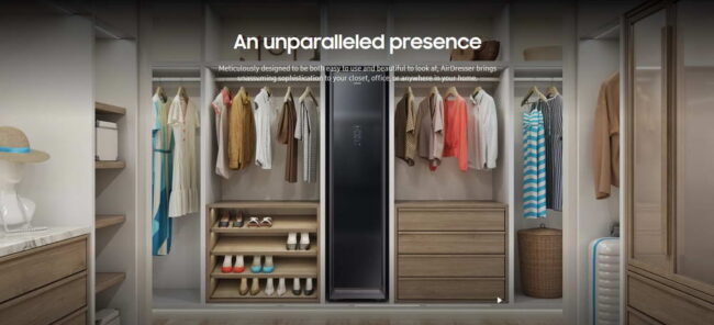 Samsung cho biết: Tủ chăm sóc quần áo thông minh AirDresser là một trong những thành quả của việc nỗ lực nghiên cứu từ Samsung để cung cấp cho người dùng giải pháp chăm sóc phong cách thời trang hoàn hảo, dù là trang phục hàng ngày hay những bộ cánh sang trọng. Thiết bị thực sự tạo ra một chuẩn mực mới về chăm dưỡng quần áo 4 -in-1 chỉ trong một thiết bị mà không cần phải giặt giũ, một giải pháp tiện lợi và nhanh chóng tại nhà.