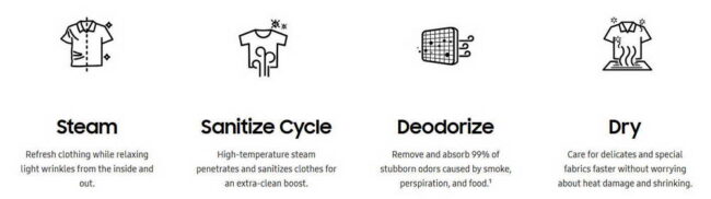 • Thứ hai, công nghệ hấp hơi nước JetSteam truyền hơi nước ở nhiệt độ cao, thẩm thấu vào quần áo để khử trùng đến 99,9% virus và vi khuẩn (các virus Adenovirus, Influenza, Coronavirus và Herpesvirus; các vi khuẩn E.coli và S.aureus theo kiểm nghiệm của Korea Univ. lab. trên chế độ Sanitise 2), tác nhân gây mùi cũng như các chất độc hại, và loại bỏ 100% mạt bụi gây dị ứng. Đồng thời, công nghệ hấp hơi nước JetSteam và thổi khí JetAir kết hợp giúp hạn chế nhăn nhúm, và giữ nếp phẳng phiu cho áo quần.