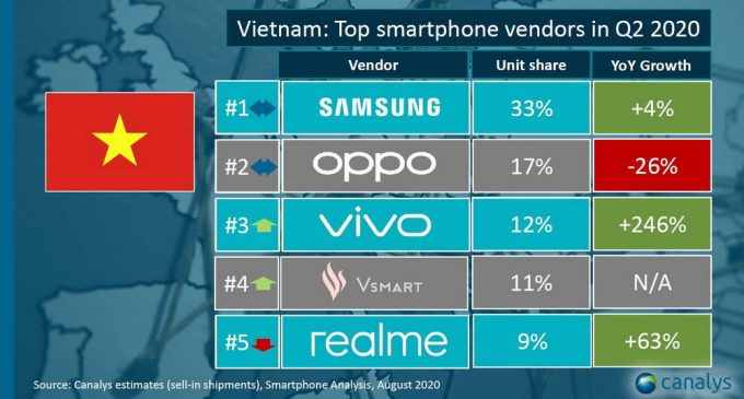 Báo cáo Top Vendors – Smartphone do Canalys thực hiện theo dõi hơn 50 thương hiệu điện thoại thông minh trên khắp thế giới và đưa ra xếp hạng hàng quý dựa trên thị phần số bán của các thương hiệu. Tại Đông Nam Á, Vivo tiếp tục giữ vững vị trí là một trong 3 thương hiệu điện thoại thông minh hàng đầu thị trường khu vực với tốc độ tăng trưởng 20% trong quý 2-2020.