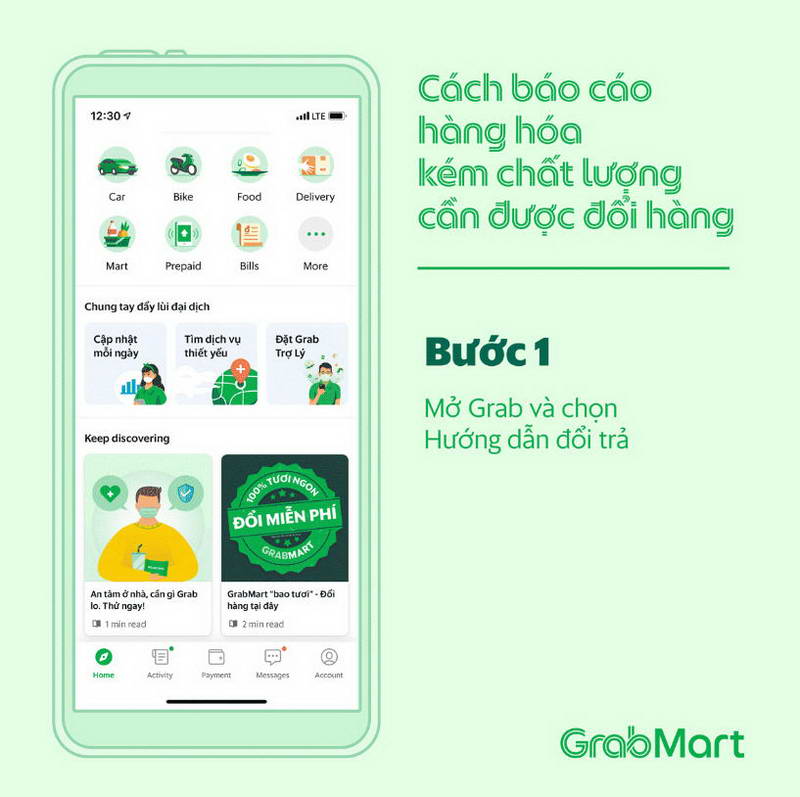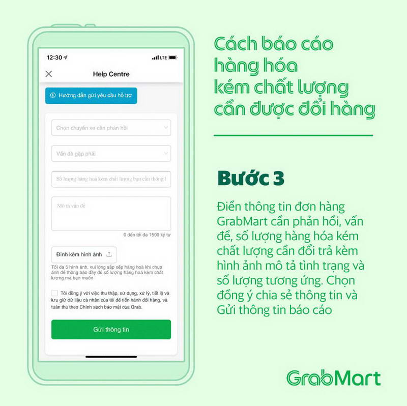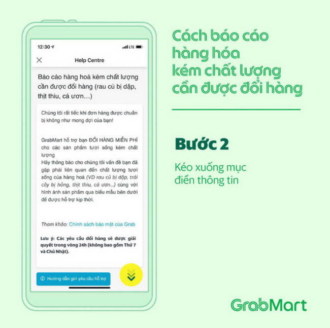 Cụ thể, các yêu cầu đổi hàng sẽ được giải quyết trong vòng 24 giờ (không bao gồm ngày thứ Bảy và Chủ nhật). Để các yêu cầu được giải quyết nhanh chóng, khách hàng cần cung cấp đầy đủ thông tin, hình ảnh đáp ứng điều khoản và điều kiện được nêu thông qua widget GrabMart “bao tươi” – Đổi hàng tại đây trên màn hình chính của ứng dụng Grab.