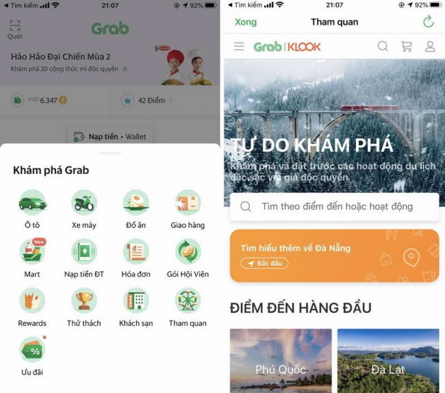 Người dùng có thể đặt các dịch vụ du lịch của Klook trên ứng dụng Grab
