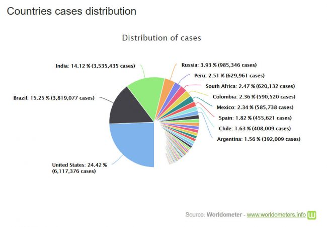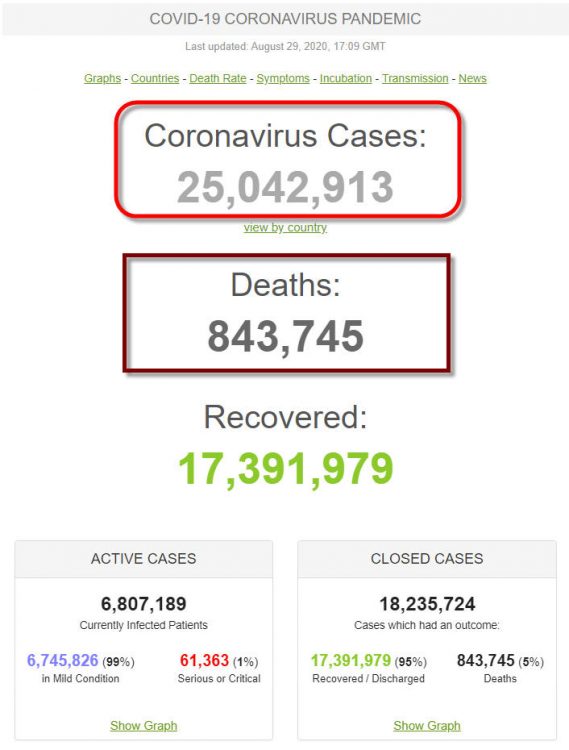 Vào ngày 29-8-2020, trang Worldometer cập nhật thế giới đã vượt mốc 25 triệu người nhiễm coronavirus SARS-CoV-2 tại 213 nước và vùng lãnh thổ (con số cụ thể là 25.042.913 người). Tổng số bệnh nhân COVID-19 tử vong thế giới lên tới 843.745 người tại 189 nước và vùng lãnh thổ (tử suất hiện là 3,38% so với tổng nhiễm).