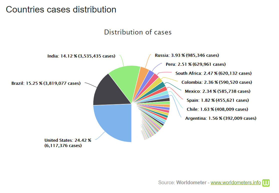 | 1 | USA | 6,117,376 | +21,141 | 186,368 | +467 | 3,381,082 | 2,549,926 | 16,190 | 18,464 | 563 | 80,622,184 | 243,340 | 331,314,584 |