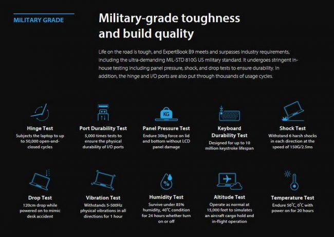 - Giải pháp phần cứng: Nhận thấy người dùng doanh nghiệp và tập đoàn lớn., luôn có yêu cầu khắt khe về chất lượng và độ tin cậy cao hơn khách hàng tiêu dùng, vì vậy, ASUS cung cấp các sản phẩm ASUS Expert Series đạt tiêu chuẩn cấp độ quân sự MIL-STD 810G, các laptop đều trải qua các bài thử nghiệm khắt khe như thử nghiệm cổng kết nối với hơn 5.000 lần kết nối/ ngắt kết nối, bài kiểm tra chịu áp lực tấm nền lên đến 25kg mà không bị hỏng màn hình LCD, kiểm tra độ bền bàn phím với hơn 10 triệu lần nhấn phím, các bài kiểm tra bản lề với hơn 20.000 chu kỳ đóng mở, hay kiểm tra khả năng chịu đựng độ cao, độ rung, chịu sốc bảo vệ thiết bị trong những điều kiện di chuyển khắc nghiệt nhất.