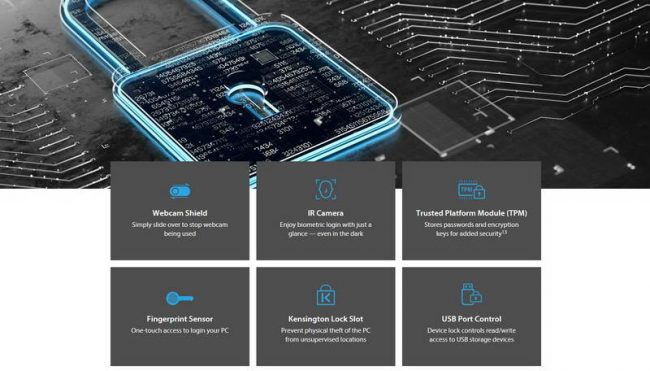 - Giải pháp bảo mật: cung cấp hệ thống bảo mật toàn diện bằng nhiều lớp phần cứng và phần mềm, giúp bảo vệ dữ liệu của bạn khỏi bị truy cập trái phép, như lớp quản lý hệ thống IT, lớp bảo mật danh tính, bảp vệ phần cứng bằng khe gắn khóa Kensington và khóa phím / cảnh báo xâm nhập khung vỏ máy.