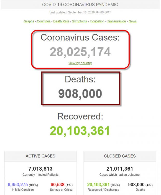 Vào đêm 9-9-2020, trang Worldometer cập nhật tổng số người nhiễm coronavirus SARS-CoV-2 trên thế giới đã vượt mốc 28 triệu người tại 213 nước và vùng lãnh thổ. Như vậy, tốc độ tăng khủng, chỉ mất có 3 ngày để có thêm 1 triệu ca nhiễm mới (mốc 27 triệu bị vượt vào tối 6-9).