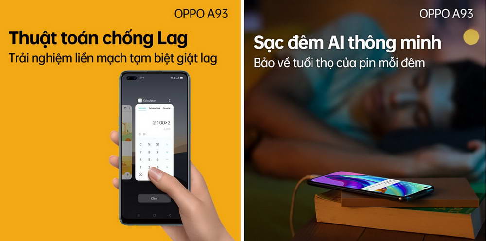 A93 tối ưu hóa trải nghiệm người dùng với vi xử lý MediaTek Helio P95 mạnh mẽ, RAM 8GB và bộ nhớ trong 128GB, có thể mở rộng đến 256GB thông qua khay thẻ 3-in-1 (2 SIM + 1 thẻ nhớ). Thuật toán chống lag (Anti-Lag Algorithm) nhận diện và dọn dẹp các dữ liệu gây lỗi bộ nhớ, hạn chế tình trạng giật lag cho thiết bị, giúp đọc và ghi dữ liệu lên hệ thống nhanh và hiệu quả hơn. Theo OPPO, những cải tiến trên giảm khả năng giật lag màn hình tới 54% so với thế hệ trước, trong khi hiệu suất đọc và ghi dữ liệu cải thiện lên tới 28%.