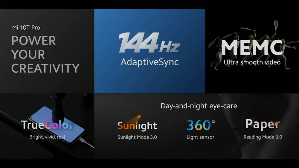 Mi 10T Pro có màn hình phẳng DotDisplay 6.67 inch FHD+ (1080 x 2400 pixel), 20:9, với tốc độ làm tươi tới 144Hz, tính năng AdaptiveSync tự động đồng bộ tốc độ màn làm tươi với các ứng dụng hỗ trợ tốc độ thấp hơn; tính năng MEMC bù chuyển động cho video mượt mà hơn; bảo vệ mắt được chứng thực TÜV Rheinland Low Blue Light Certification. Chế độ đọc dưới ánh nắng Sunlight Mode 3.0, chế độ đọc sách Reading Mode 3.0.