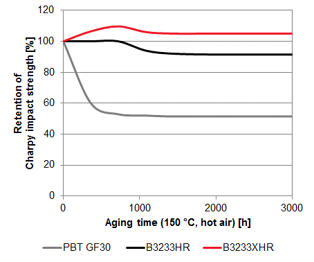 Rất nhiều thiết bị điện và điện tử hiện phải chịu tải nhiệt ngay càng cao do không gian lắp đặt hạn chế hoặc nhiệt độ hoạt động cao. Khi sử dụng trong môi trường khô ráo, nhựa cho các thiết bị này cần chịu được không khí nóng trong thời gian dài. “Đây là một điểm mạnh khác của Pocan XHR. Thí dụ, độ bền va đập (impact strength) của hầu hết các loại sản phẩm trong dòng XHR hầu như không bị ảnh hưởng, kể cả khi nó được bảo quản trong môi trường 150°C trong 3.000 tiếng đồng hồ”, ông Heinen cho biết thêm. “Chính vì vậy, các hợp chất trên là lựa chọn lý tưởng để sản xuất các bộ phận trong khoang động cơ như đầu nối (connectors), hoặc để cấp điện cho các bộ phận điện tử.”