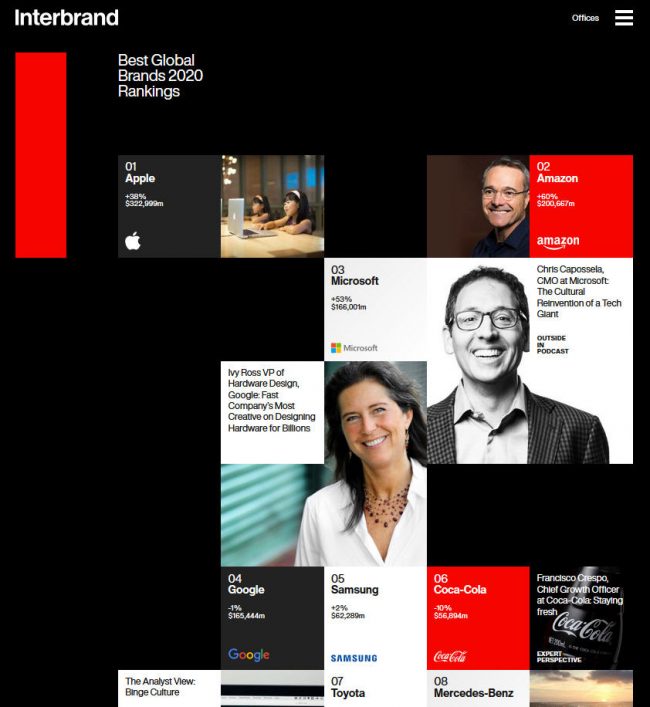 Interbrand đánh giá giá trị thương hiệu của doanh nghiệp dựa trên phân tích toàn diện của nhiều yếu tố bao gồm hiệu quả tài chính, ảnh hưởng của thương hiệu đến việc mua hàng và khả năng cạnh tranh của thương hiệu.