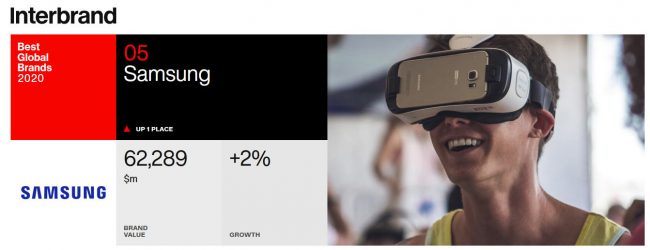 Dù cho môi trường kinh doanh đầy thách thức do đại dịch COVID-19 gây ra cho các công ty toàn cầu trong năm 2020, giá trị thương hiệu của Samsung vẫn tăng 2%, từ 61,1 tỷ USD trong năm 2019 lên 62,3 tỷ USD trong năm nay. Samsung đã vươn lên vị trí thứ 5 toàn cầu trong 3 năm sau khi đạt vị trí thứ 6 trong danh sách các thương hiệu tốt nhất toàn cầu năm 2017. Công ty đã ghi nhận mức tăng trưởng giá trị thương hiệu bền vững kể từ khi bắt đầu ở vị trí thứ 43 vào năm 2000 khi Interbrand bắt đầu công bố danh sách các Thương hiệu Tốt nhất Toàn cầu. Và kể từ khi lọt Top 10 với vị trí thứ 9 vào năm 2012, Samsung đã tiếp tục đà tăng trưởng ổn định để đạt vị trí thứ 6 vào năm 2017 và vị trí thứ 5 vào năm 2020.