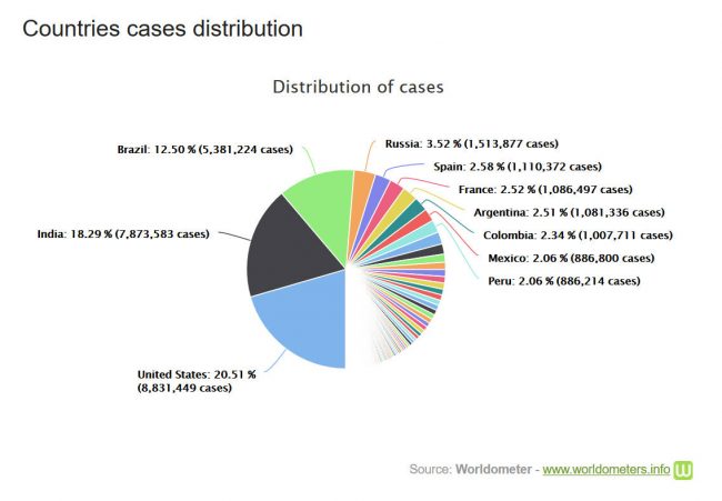 Theo số liệu của Worldometer tối 25-10-2020 theo giờ VN, Mỹ đã có hơn 8,8 triệu ca nhiễm và hơn 230.000 người chết. Kế đó là Ấn Độ có hơn 7,8 triệu ca nhiễm và hơn 118.000 người chết. Brazil thứ ba với hơn 5,3 triệu ca nhiễm và hơn 156.000 người chết. Nga thứ tư với hơn 1,5 triệu ca nhiễm và hơn 26.000 người chết. Thế giới vừa có thêm 2 nước vào nhóm nước có hơn 1 triệu ca nhiễm là Pháp (ngày 23-10) và Colombia (ngày 24-10). Nhóm này hiện gồm 8 nước. Mỹ, Ấn Độ và Brazil là 3 nước cho tới nay có hơn 100.000 người chết.