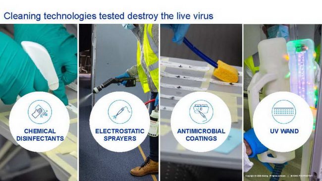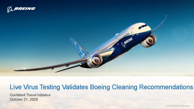 Trong chuỗi các hoạt động thử nghiệm lần đầu tiên được thực hiện, hãng chế tạo máy bay Boeing và Đại học Arizona (Mỹ) đã xác thực khả năng tiêu diệt virus SARS-CoV-2 của các giải pháp khử trùng hiện hành được các hãng hàng không sử dụng. Đây là lần đầu tiên họ tiến hành các thử nghiệm xác thực này với virus sống (live virus) ngay trên khoang một chiếc máy bay hành khách. Đây là một hoạt động trong chương trình Sáng kiến Tự tin Du lịch (Confident Travel Initiative – CTI) nhằm hỗ trợ các khách hàng, cũng như nâng cao sự an toàn của hành khách và phi hành đoàn trong đại dịch COVID-19.