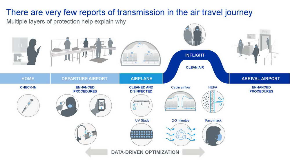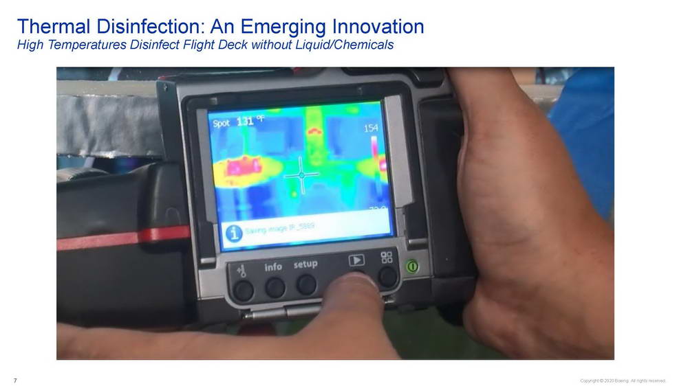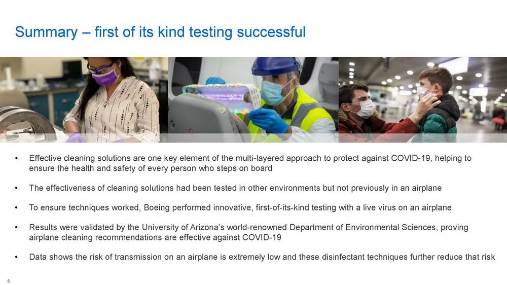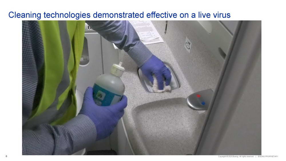 Trong chuỗi các hoạt động thử nghiệm lần đầu tiên được thực hiện, hãng chế tạo máy bay Boeing và Đại học Arizona (Mỹ) đã xác thực khả năng tiêu diệt virus SARS-CoV-2 của các giải pháp khử trùng hiện hành được các hãng hàng không sử dụng. Đây là lần đầu tiên họ tiến hành các thử nghiệm xác thực này với virus sống (live virus) ngay trên khoang một chiếc máy bay hành khách. Đây là một hoạt động trong chương trình Sáng kiến Tự tin Du lịch (Confident Travel Initiative – CTI) nhằm hỗ trợ các khách hàng, cũng như nâng cao sự an toàn của hành khách và phi hành đoàn trong đại dịch COVID-19.