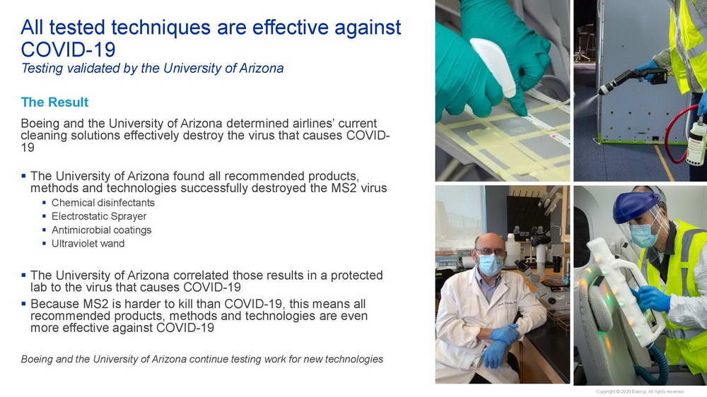 Hãng Boeing và Đại học Arizona tiếp tục thử nghiệm các phương pháp vệ sinh được khuyến nghị trong một phòng thí nghiệm chống lại SARS-CoV-2 và các loại virus tương tự khác để xác thực thêm tính hiệu quả.