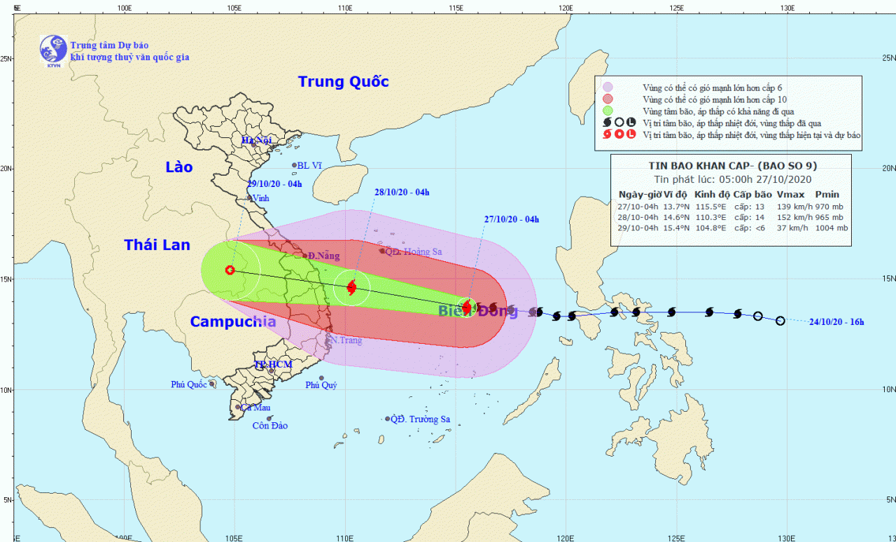 Bản tin khẩn cấp về cơn bão số 9 (tên quốc tế là Molave) do Trung tâm Dự báo Khí tượng Thủy văn Quốc gia phát lúc 5 giờ sáng 27-10-2020.
