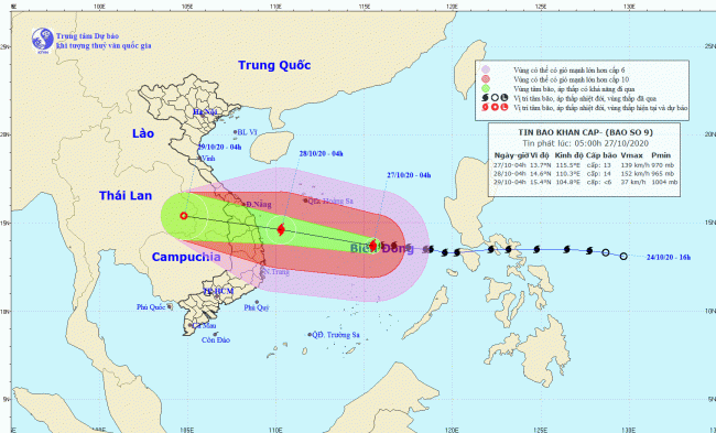 Bản đồ dự báo bão số 9 (Molave) do Trung tâm Dự báo Khí tượng Thủy văn Quốc gia phát lúc 5g ngày 27-10-2020.