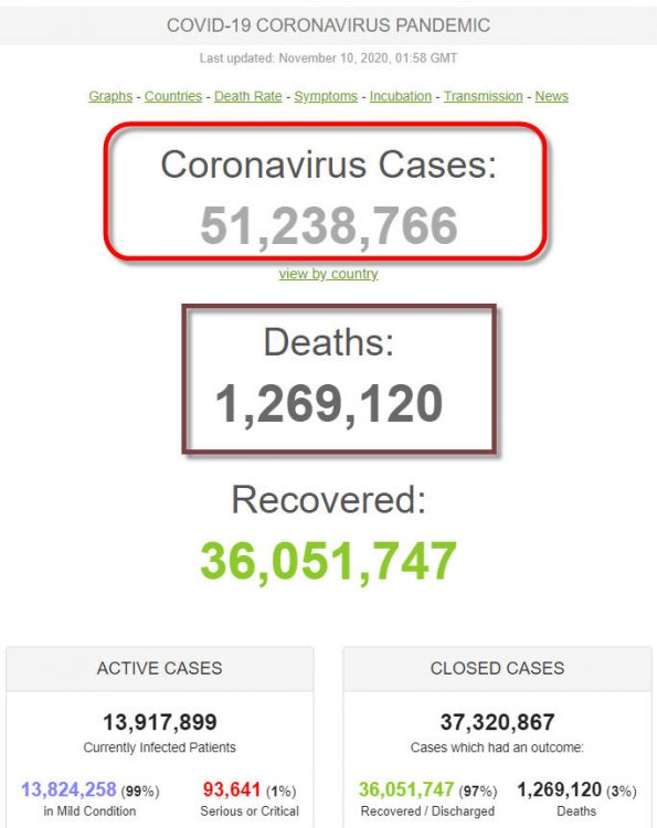Ngày 9-11-2020 theo giờ GMT, tức rạng sáng 10-11-2020 theo giờ VN, trang Worldometer cập nhật thế giới đã vượt qua mốc 51 triệu người nhiễm coronavirus SARS-CoV-2 tại 216 nước và vùng lãnh thổ. Tốc độ vẫn tăng khủng, suốt từ khi đạt mốc 23 triệu người vào ngày 27-9 tới nay, chỉ mất có 2-3 ngày để có thêm 1 triệu ca nhiễm mới (mốc 50 triệu người bị vượt vào ngày 7-11). Và từ ngày đạt mốc 43 triệu người vào ngày 25-10 đến nay, cứ 2 ngày có thêm 1 triệu ca nhiễm mới. Riêng từ 49 triệu lên 50 triệu chỉ cần chưa tới 2 ngày.
