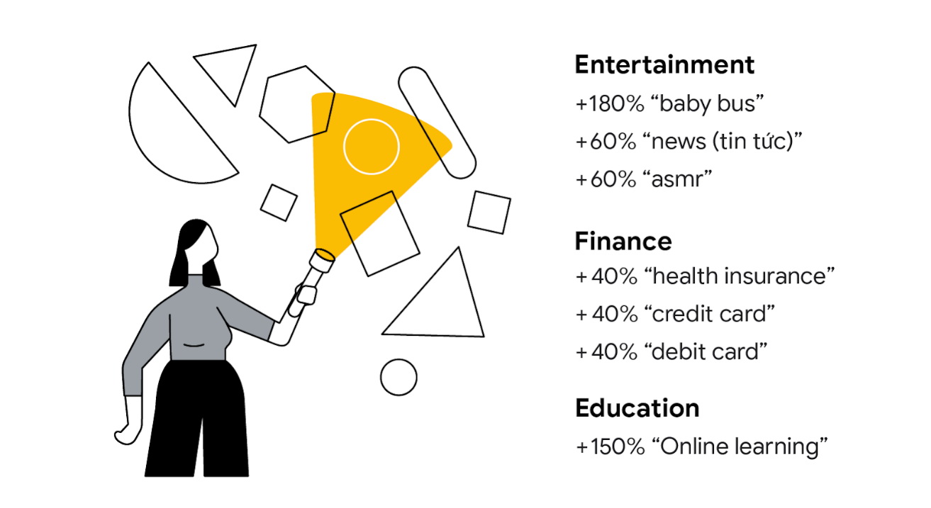 Tương tự như vậy, Giáo dục và Quản lý tiền bạc cũng có sự gia tăng ổn định trong lượt tìm kiếm. Cứ ba người thuộc thế hệ Z (Gen Z sinh từ 1997 tới 2012) thì có một người đã sử dụng Internet chỉ trong tháng trước để học hỏi và phát triển nền tảng kiến thức của họ. Ngoài ra, người tiêu dùng ở Việt Nam cũng đang ngày càng chuyển từ các chi nhánh vật lý sang phương tiện trực tuyến để phục vụ nhu cầu tài chính của họ, dẫn đến lượt tải xuống các ứng dụng tài chính tăng 33% và lượt tìm kiếm “ứng dụng cho vay trực tuyến” tăng 300% trong năm qua.