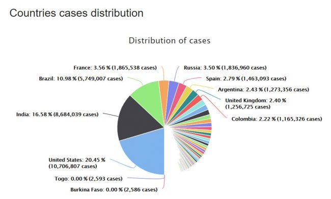 Ngày 19-10 có thêm 2 nước Tây Ban Nha và Argentina vào nhóm nước có hơn 1 triệu ca nhiễm; ngày 23-10 thêm Pháp, ngày 24-10 thêm Colombia, ngày 31-10 thêm Anh, ngày 11-11 thêm Ý vào nhóm có hơn 1 triệu ca nhiễm (tổng cộng hiện có 10 nước – Mỹ, Ấn Độ, Brazil, Nga, Tây Ban Nha, Argentina, Pháp, Colombia, Anh và Ý).