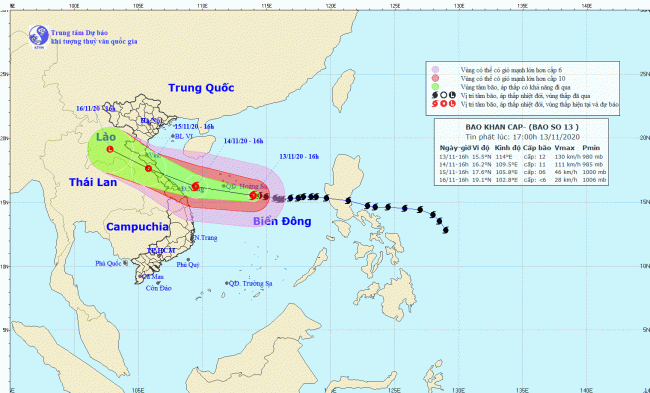 Bản tin lúc 17g ngày 13-11-2020 của Trung tâm Dự báo Khí tượng Thủy văn Quốc gia về cơn bão số 13 (tên quốc tế là Vamco) cho biết: