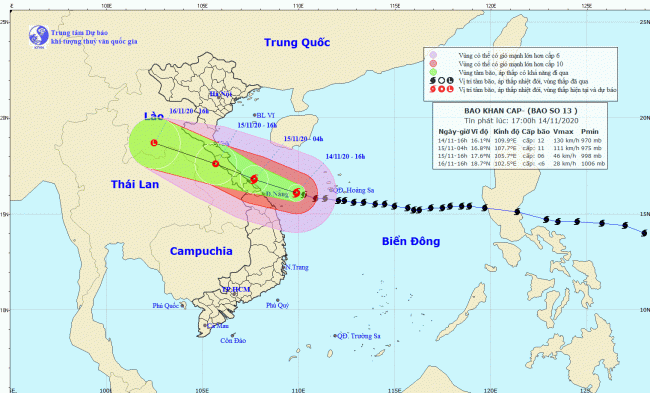 Bản tin lúc 17g ngày 14-11-2020 của Trung tâm Dự báo Khí tượng Thủy văn Quốc gia về cơn bão số 13 (tên quốc tế là Vamco) cho biết: