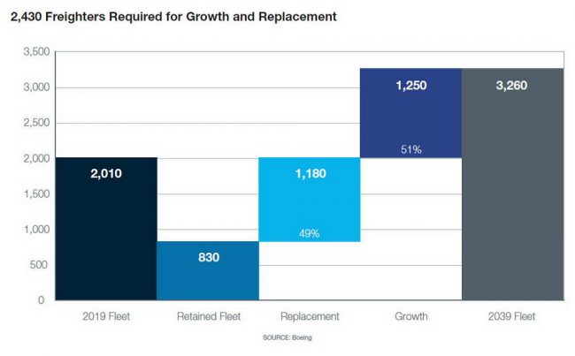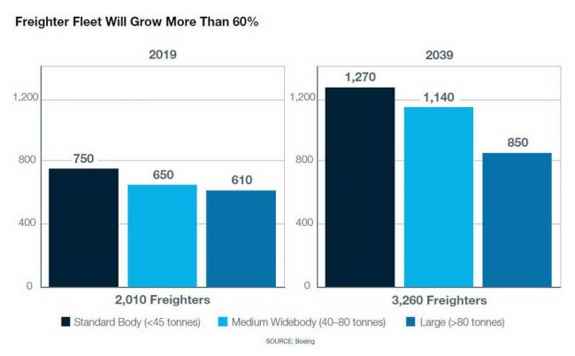 Theo dự báo mới, lưu lượng chở hàng bằng máy bay của thế giới sẽ tăng 4% mỗi năm trong hai thập niên tới. Mức tăng trưởng này được tác động bởi các hoạt động thương mại và nhu cầu gia tăng về giao hàng nhanh nhằm hỗ trợ sự mở rộng của thương mại điện tử. Với những sự phát triển này và nhu cầu đã được chứng minh về công suất máy bay chở hàng chuyên dụng nhằm hỗ trợ hệ thống vận tải của thế giới, đội bay chở hàng toàn cầu được dự báo sẽ tăng trưởng hơn 60% đến năm 2039.