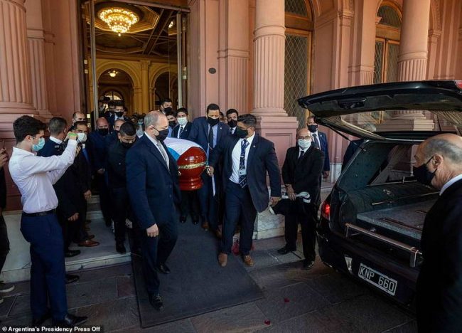 Cỗ áo quan phủ quốc kỳ Argentina của Maradona đã được di chuyển từ nơi quàn là Phủ Tổng thống Casa Rosada để di chuyển tới nơi an táng.