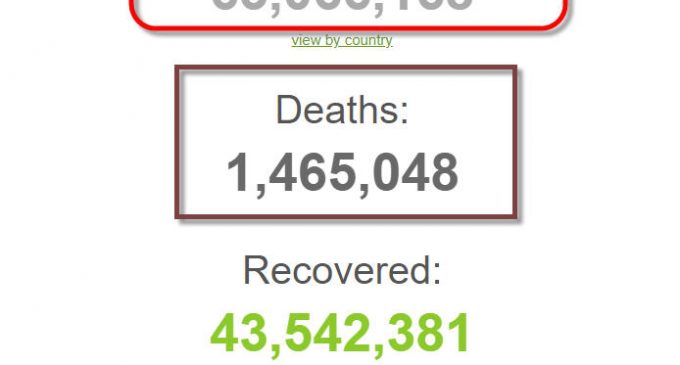 Khuya 29-11-2020 theo giờ GMT, tức sáng 30-11 theo giờ VN, trang Worldometer cập nhật thế giới đã vượt qua mốc 63 triệu người nhiễm coronavirus SARS-CoV-2 tại 218 nước và vùng lãnh thổ. Tốc độ vẫn tăng khủng, suốt từ khi đạt mốc 23 triệu người vào ngày 27-9 tới nay, chỉ mất có 2-3 ngày để có thêm 1 triệu ca nhiễm mới (mốc 62 triệu người bị vượt vào ngày 28-11). Và từ ngày đạt mốc 43 triệu người vào ngày 25-10 đến nay, cứ 2 ngày có thêm 1 triệu ca nhiễm mới. Riêng từ 49 triệu lên 50 triệu, từ 52 triệu lên 53 triệu, từ 56 triệu lên 57 triệu, từ 57 triệu lên 58 triệu người, và từ 59 triệu người lên 60 triệu người chỉ cần chưa tới 2 ngày.