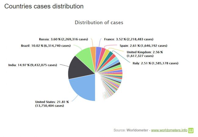 Theo số liệu của Worldometer sáng 30-11-2020 theo giờ VN, Mỹ đã có hơn 13,7 triệu ca nhiễm và hơn 273.000 người chết. Kế đó là Ấn Độ có hơn 9,4 triệu ca nhiễm và hơn 137.000 người chết. Brazil thứ ba với hơn 6,2 triệu ca nhiễm và hơn 172.000 người chết. Nga thứ 4 có hơn 2,26 triệu ca nhiễm và hơn 39.000 người chết. Pháp thứ 5 có hơn 2,21 triệu ca nhiễm và hơn 52.000 người chết. Thế giới đã có 12 nước có hơn 1 triệu ca nhiễm (lần lượt là Mỹ, Ấn Độ, Brazil, Nga, Pháp, Tây Ban Nha, Argentina, Colombia, Anh, Ý, Mexico, Đức).