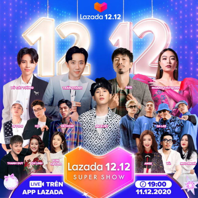 - Lazada tiếp tục kích hoạt chuỗi hoạt động trực tuyến diễn ra liên tục trong 24 giờ từ 0g – 23g59 ngày 11-12. Trong đó, nổi bật nhất là Đại nhạc hội trực tuyến Lazada Super Show 12.12 diễn ra lúc 19g ngày 11-12 trên ứng dụng Lazada cũng như được tiếp sóng trên các đài truyền hình HTV7, VTC9, HN1 và kênh YouTube của Lazada.