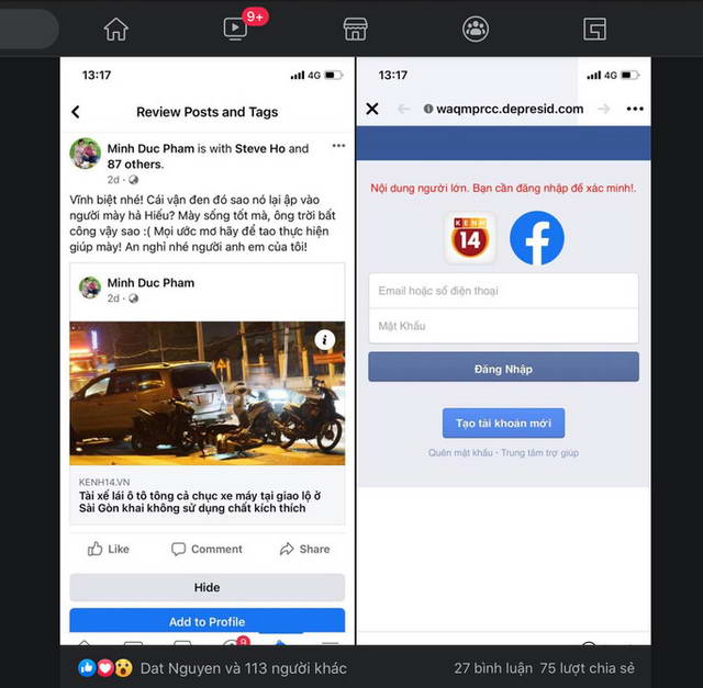 Anh Lê Minh, một chuyên viên nghiên cứu tại Viện Kỹ thuật Công nghệ cao NTT – Đại học Nguyễn Tất Thành mới đây chia sẻ trên báo chí: Nếu bạn thấy một ai đó trên Facebook gắn thẻ mình vào một bài viết khóc thương một người bạn (mà bạn chẳng rõ đó là ai) kèm theo một bài báo thì 99% là bạn đang bị “câu” (fishing) để tự khai thông tin đăng nhập Facebook của mình. Nếu click vào link được cung cấp để đọc bài, người dùng sẽ thấy yêu cầu đăng nhập lại Facebook vì đây là nội dung “người lớn” (có ảnh tai nạn). Nếu bạn tiến hành đăng nhập lại theo yêu cầu là coi như bạn bị mất tài khoản.