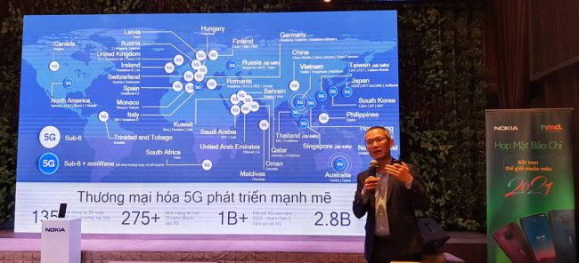 Ông Thiều Phương Nam, Tổng giám đốc Qualcomm Việt Nam, Campuchia và Lào, tại sự kiện ra mắt Nokia 5.4 ở TP.HCM tối 6-1-2021 cho biết việc thương mại hóa 5G trên thế giới đang phát triển mạnh mẽ. (Ảnh: P.H.P.)