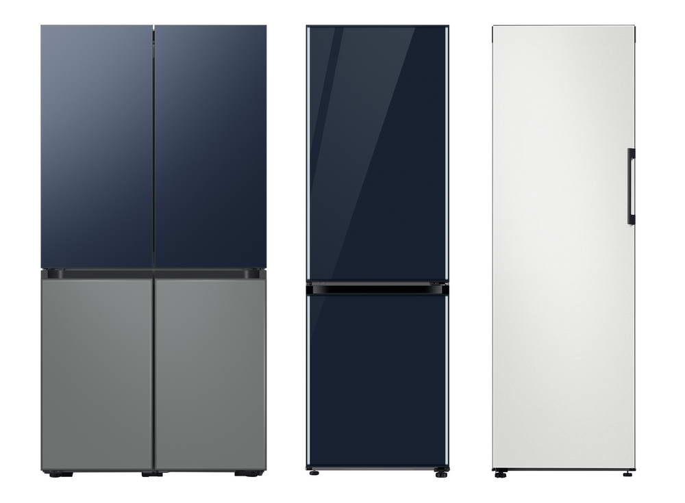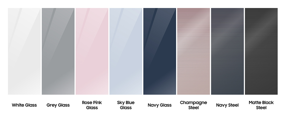 Tủ lạnh Bespoke cho phép người dùng kết hợp các phiên bản khác nhau, với tám màu sắc độc đáo cùng các chất liệu đặc biệt như kính hoặc thép. Các tùy chọn màu sắc bao gồm Grey Glass, Sky Blue Glass, Navy Steel, Champagne Steel, Matte Black Steel, Navy Glass, White Glass, và Rose Pink Glass.