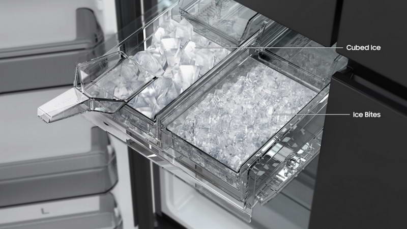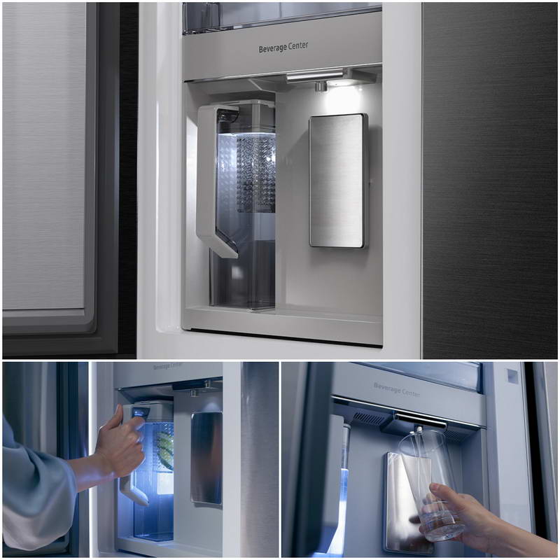 Với thiết kế tổng thể đẹp mắt, dòng tủ lạnh Bespoke 4 cửa của Samsung đi kèm với tính năng Beverage Center trong cửa trên bên trái, cung cấp nước uống theo hai cách khác nhau, với một bình đựng nước lọc bên trong kèm thêm một bình đựng nước AutoFill. Bình đựng nước AutoFill tự động đổ đầy nước lọc. Ngoài ra, bình nước này có thể giúp bạn dễ dàng pha nước với hương vị tùy thích. Tủ lạnh cũng có tính năng Dual Ice Maker ngoài việc tạo ra những viên đá thông thường (Cubed Ice) còn có thể tạo ra những viên đá nhỏ (Ice Bites) để làm lạnh đồ uống nhanh hơn, cũng như thích hợp với những món uống đặc biệt.