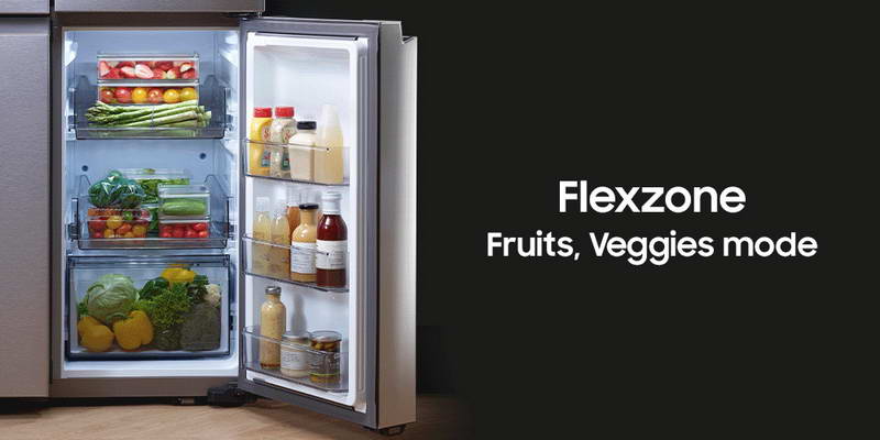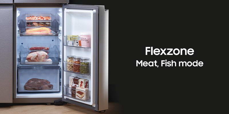 Tủ lạnh Bespoke 4 cửa của Samsung có tính năng Flex Zone cải tiến, với một ngăn linh hoạt có thể chuyển đổi từ nhiệt độ tủ lạnh sang ngăn đá để đáp ứng nhu cầu lưu trữ thực phẩm của gia đình. Flex Zone có 5 chế độ nhiệt độ khác nhau: Đông lạnh, Đông mềm, Thịt / Cá, Trái cây / Rau và Đồ uống. Ngoài ra, tính năng Flex Crisper cho phép bạn bảo quản thịt hoặc cá ở nhiệt độ tối ưu, cũng như Crisper+ giúp giữ trái cây và rau quả tươi lâu hơn.