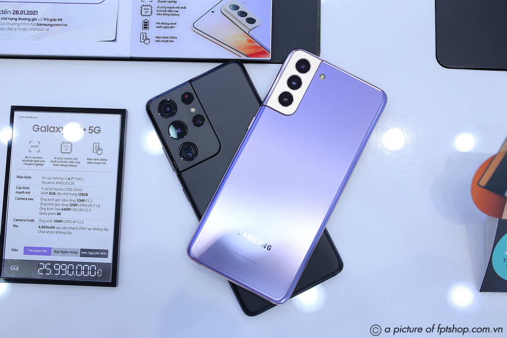 • Galaxy S21+ có giá bán là 25.990.000 đồng với 3 màu tím, bạc và đen.