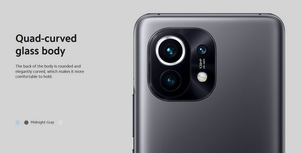 Mi 11 có mặt lưng bằng kính được hoàn thiện phủ lớp mờ chống chói kép tiên tiến giúp bắt sáng, không bám dấu vân tay. Có 2 lớp phủ màu chồng lên nhau với lớp dưới phát quang tạo màu đặc biệt và biến đổi khác nhau tùy góc nhìn. Mi 11 có 2 phiên bàn màu: Xám Bán Dạ (Midnight Gray) và Xanh Chân Trời (Horizon Blue).