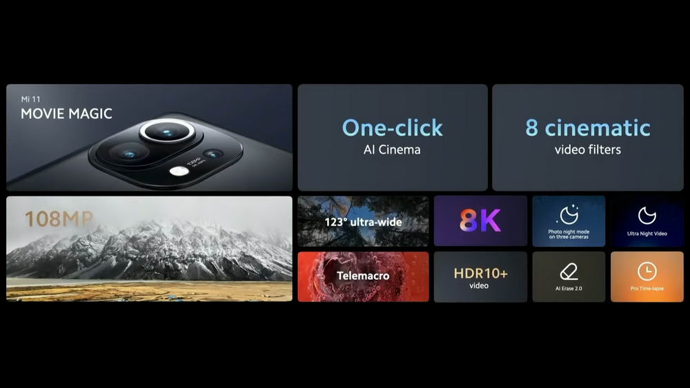 Xiaomi M11 có slogan “Movie Magic” (thần kỳ điện ảnh) được giới thiệu là “chụp ảnh như đạo diễn” và “biên tập phim ảnh như studio” với sức mạnh của một studio phim thu nhỏ.