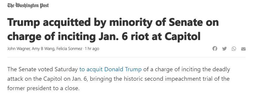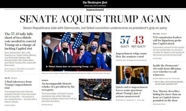 Trong buổi bỏ phiếu luận tội ngày 13-2-2021 tại Thượng viện, toàn bộ 48 nghị sĩ Dân chủ cộng thêm 2 nghị sĩ độc lập ủng hộ phe Dân chủ và 7 nghị sĩ Cộng hòa đã bỏ phiếu “có tội” đối với ông Trump, trong khi 43 nghị sĩ Cộng hòa bỏ phiếu “vô tội”. Tổng cộng có 57 phiếu “có tội”, nhưng vẫn không đủ số lượng 2 phần 3 theo quy định (tức 67 phiếu) để có thể kết tội ông Trump.