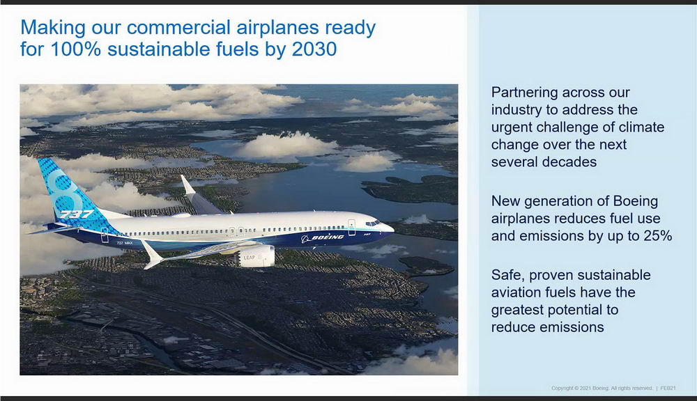 Boeing đặt mục tiêu tất cả máy bay thương mại của hãng sẵn sàng để sử dụng 100% nhiên liệu bền vững (sustainable aviation fuels) vào năm 2030. Các thế hệ mới của máy bay Boeing giảm lượng nhiên liệu sử dụng và khí thải đến 25%. Cụ thể như dòng máy bay mới B777X có thể giảm tới 40% mức tiêu thụ nhiên liệu.