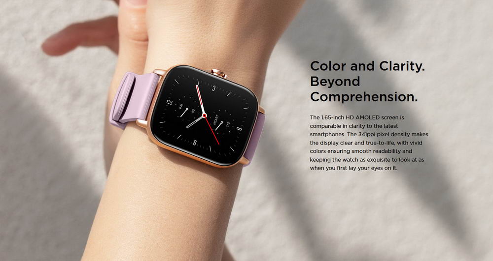 Màn hình của GTS 2e sử dụng tấm nền cao cấp AMOLED kích thước 1.65 inch, mật độ điểm ảnh 341ppi nên có độ nét tương tự như trên các điện thoại thông minh cao cấp. Mật độ điểm ảnh cao kết hợp với màu sắc rực rỡ từ tấm nền giúp màn hình hiển thị luôn rõ ràng và rực rỡ. Để tăng tính thời trang, ngoài các mặt đồng hồ có thể thay đổi theo không gian sử dụng, người dùng chỉ cần vài giây để tùy biến các loại dây đeo theo sở thích.