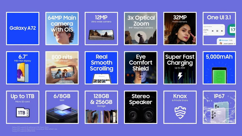 Sự ra đời của Galaxy A52 và A72 đánh dấu hành trình nhiều năm tiên phong, dẫn đầu những trào lưu công nghệ của dòng smartphone tầm trung và cận cao cấp Samsung Galaxy A series. Những sản phẩm công nghệ đột phá như Galaxy A7 khơi nguồn trào lưu ảnh du lịch, khám phá, cùng những góc ảnh siêu rộng, và Galaxy A51, A71 khởi đầu phong trào chụp ảnh nghệ thuật Macro. Galaxy A52 và A72 sẽ tiếp tục tiên phong mang đến những cải tiến công nghệ mới mẻ cho người dùng.