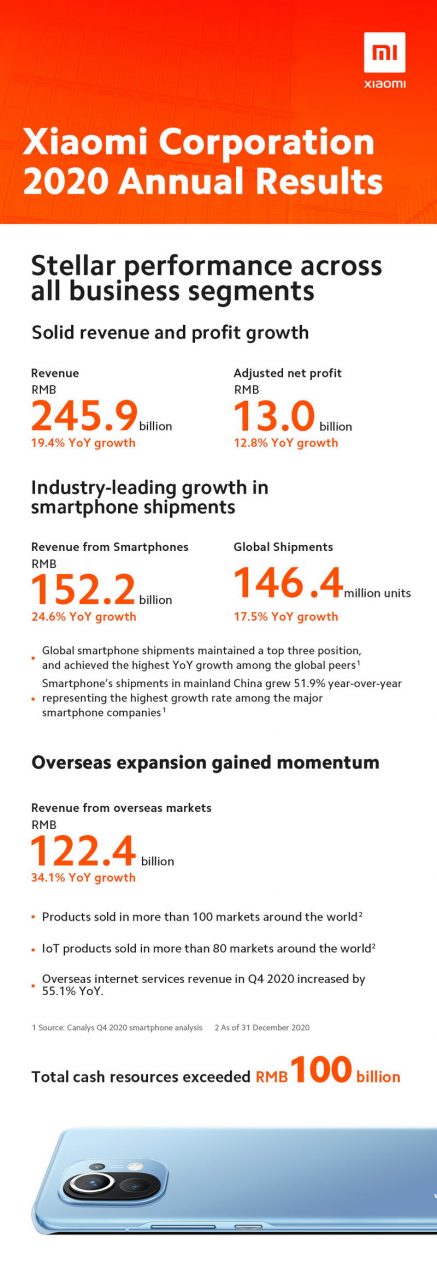 Năm 2020, doanh thu từ điện thoại thông minh của Xiaomi đạt 152,2 tỷ NDT, tăng 24,6% so với năm ngoái. Tổng lượng xuất xưởng điện thoại thông minh toàn cầu của tập đoàn đạt 146,4 triệu đơn vị, tăng 17,5% so với năm ngoái.