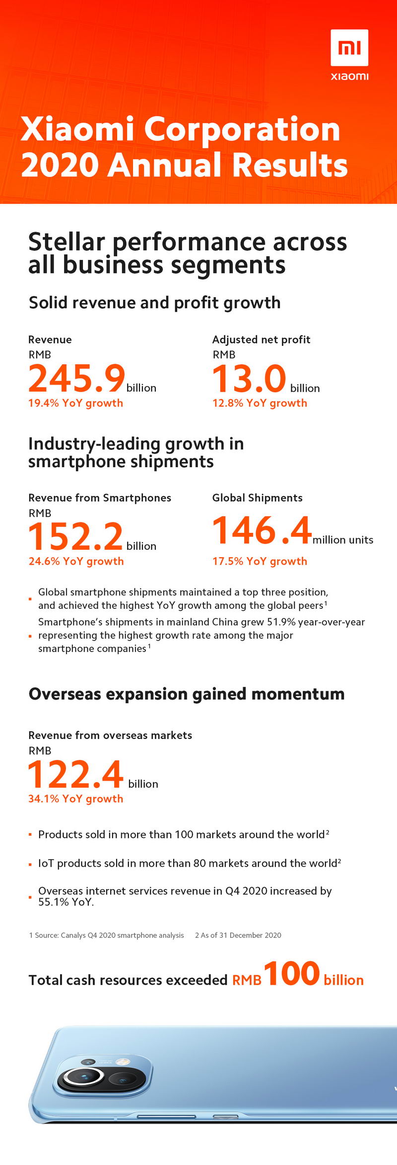 Năm 2020, tổng doanh thu của Xiaomi đạt tới 245,9 tỷ nhân dân tệ (NDT), tăng 19,4% so với năm trước; lợi nhuận ròng đã điều chỉnh trong năm là 13 tỷ NDT, tăng 12,8% so với năm ngoái. Riêng quý 4-2020, doanh thu của Xiaomi đạt 70,5 tỷ NDT, tăng 24,8% so với cùng kỳ năm ngoái; lợi nhuận ròng đã điều chỉnh là 3,2 tỷ NDT, tăng 36,7% so với cùng kỳ năm ngoái.