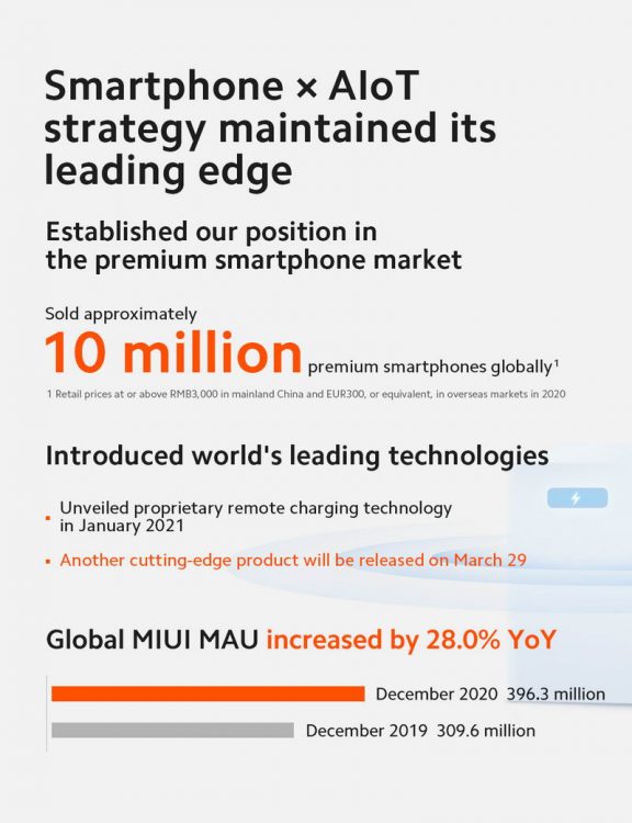 Xuyên suốt năm qua, Xiaomi tiếp tục theo đuổi chiến lược thương hiệu kép. Năm 2020, Xiaomi đã bán được khoảng 10 triệu điện thoại thông minh cao cấp trên toàn cầu với giá bán lẻ ở mức 3.000 NDT trở lên tại thị trường nội địa và 300 EUR hoặc tương đương ở các thị trường nước ngoài. Vào tháng 12-2020, Mi 11 có mức tiêu thụ vượt mốc 1 triệu chiếc trong 21 ngày đầu tiên mở bán. Mặt khác, thương hiệu Redmi vẫn cam kết đưa công nghệ tiên tiến tiếp cận với thị trường đại chúng. Dòng Redmi Note 9 được thị trường đón nhận tốt, bán được hơn 30 triệu chiếc trên toàn cầu, từ thời điểm ra mắt ngày 12-3-2020 đến ngày 31-12-2020.