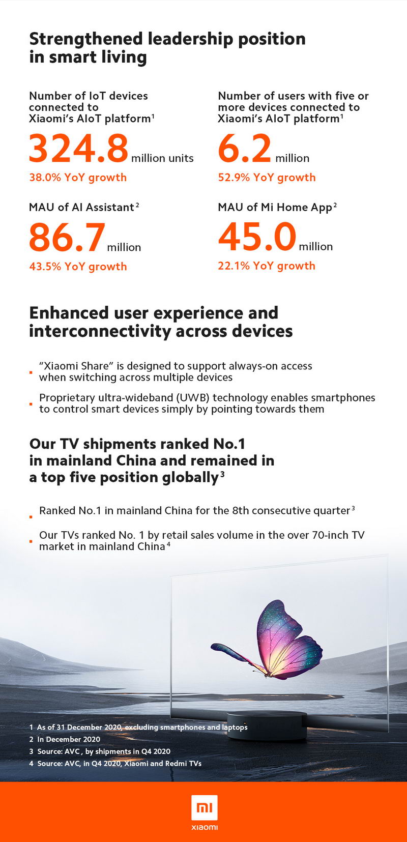 Xiaomi tiếp tục thực hiện chiến lược “Smartphone và AIoT” xây dựng hệ sinh thái sống thông minh toàn cầu xoay quanh chiếc điện thoại thông minh. Tính đến ngày 31-12-2020, số lượng thiết bị IoT được kết nối (không bao gồm điện thoại thông minh và máy tính xách tay) trên nền tảng AIoT của Xiaomi bán ra đạt 324,8 triệu đơn vị, tăng 38% so với cùng kỳ năm ngoái. Số lượng người dùng có từ 5 thiết bị trở lên được kết nối với nền tảng AIoT của Xiaomi (không bao gồm điện thoại thông minh và máy tính xách tay) đạt 6,2 triệu người, tăng 52,9% so với cùng kỳ năm trước.