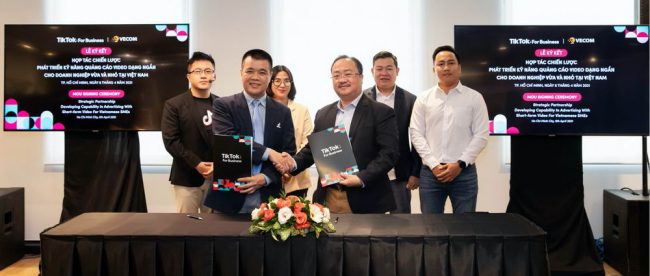 Ngày 8-4-2021 tại TP.HCM, TikTok đã ký kết hợp tác chiến lược với Hiệp hội Thương mại Điện tử Việt Nam (VECOM). Đại diện TikTok (bên trái) và VECOM sau khi ký kết.