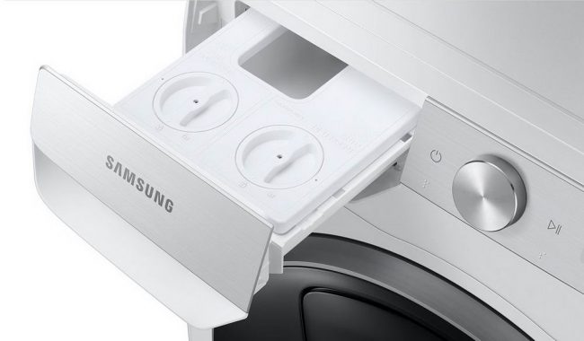Ngăn nước giặt xả thông minh AI Dispenser tự động cân chỉnh lượng nước giặt và nước xả phù hợp nhờ cảm biến khối lượng của quần áo; có thể đổ đầy nước giặt và nước xả 1 lần cho 1 tháng sử dụng (tương đương với 16-20 lần giặt). Ngăn nước giặt có nắp kín giúp bảo quản chất lượng nước giặt xả và thiết kế dễ dàng tháo rời để vệ sinh. Khi nước giặt trong ngăn đã hết, máy giặt sẽ tự động báo tín hiệu cần đổ thêm.