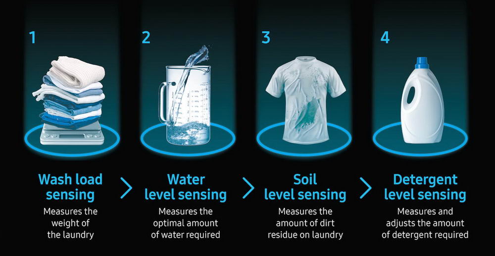 Công nghệ Giặt cảm biến thông minh AI Wash trang bị hệ thống 4 cảm biến – phân tích khối lượng và độ bẩn áo quần, từ đó tối ưu lượng nước, lượng nước giặt xả và thời gian giặt. Trong quá trình giặt, cảm biến độ bẩn sử dụng công nghệ ánh sáng truy tìm vết bẩn; tùy vào độ bẩn mà máy giặt sẽ điều chỉnh thời gian giặt và thêm bớt nước giặt xả; giúp áo quần sạch hơn mà không cần tốn nhiều công sức.